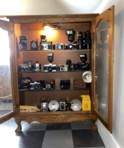 None of the cameras are worth much, but a few, like my old Pentax MX, have some good memories associated with them. Another belonged to my father. There are more cameras to be added to this collection, including a few of Pam’s (one a Brownie box belonging to her mother), plus one using flash cubes (remember those?) with a flash cube extender (deluxe!).