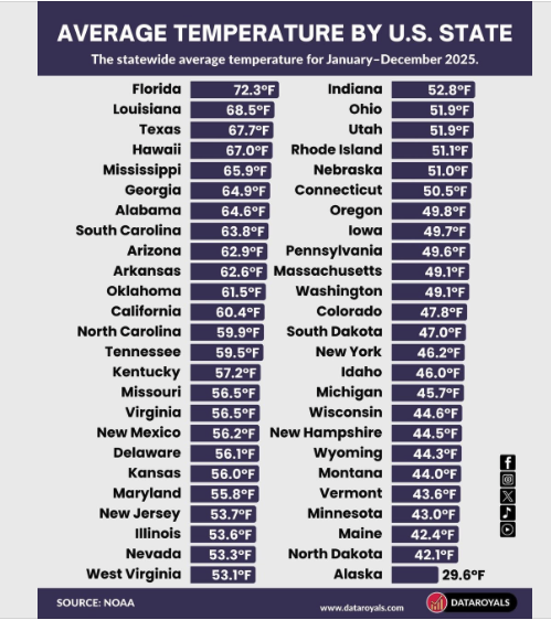 I did come across a NOAA chart showing the average yearly temperatures for all 50 states and was surprised to see Hawaii is not #1, it is #4.
