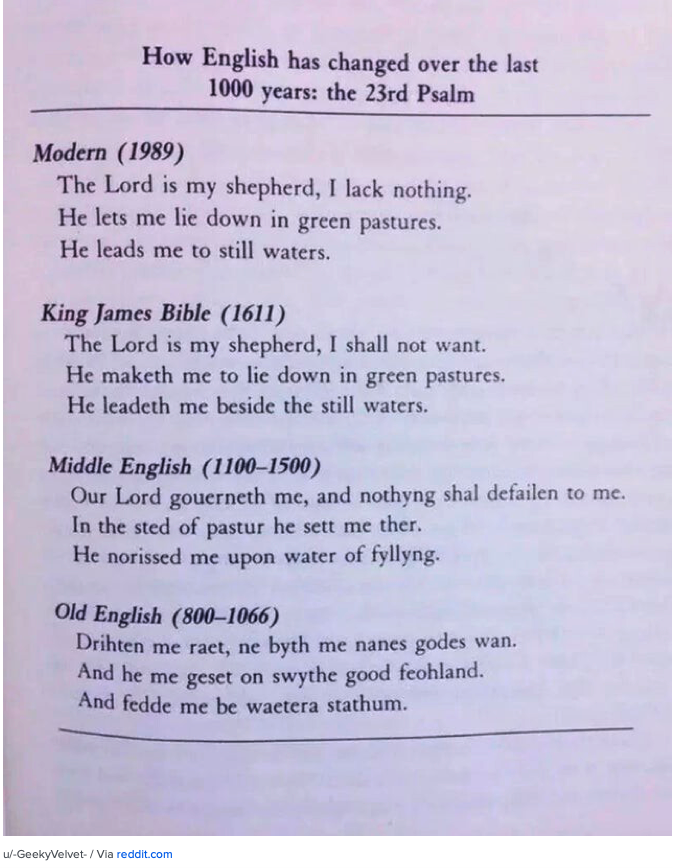 In other trivia, here is an example of how the English language has evolved over the last 10 centuries.